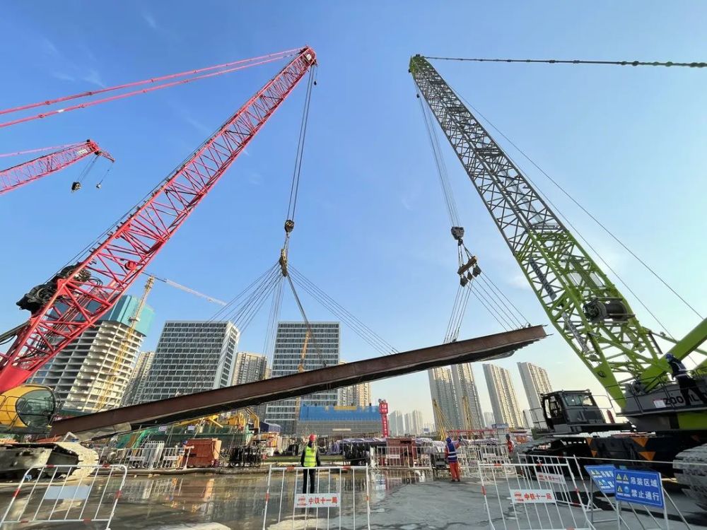 据现场技术人员介绍,30日吊装的首幅地连墙槽深68m,钢筋笼总长67.9m,重达104吨。地铁中央商务区站地连墙吊装工程为超危工程,为此在首幅地连墙钢筋笼吊装前,项目多次组织方案研讨会,邀请外部专家进行方案评审,制定严格缜密的钢筋笼吊装方案,以确保在实际吊装过程中的可行性与安全性。
